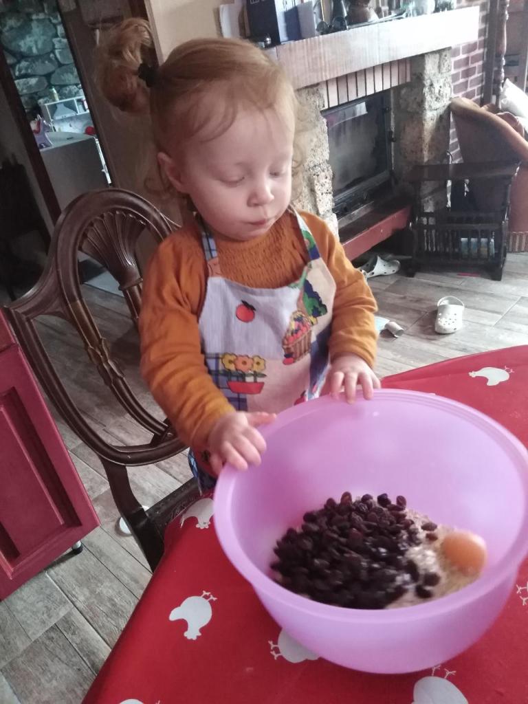 - Avec Maxine on a fait des cookies aux flocons d’avoine et aux raisins secs. (Ce qui veut dire « elle a mangé les raisins secs en me regardant rassembler les ingrédients »).