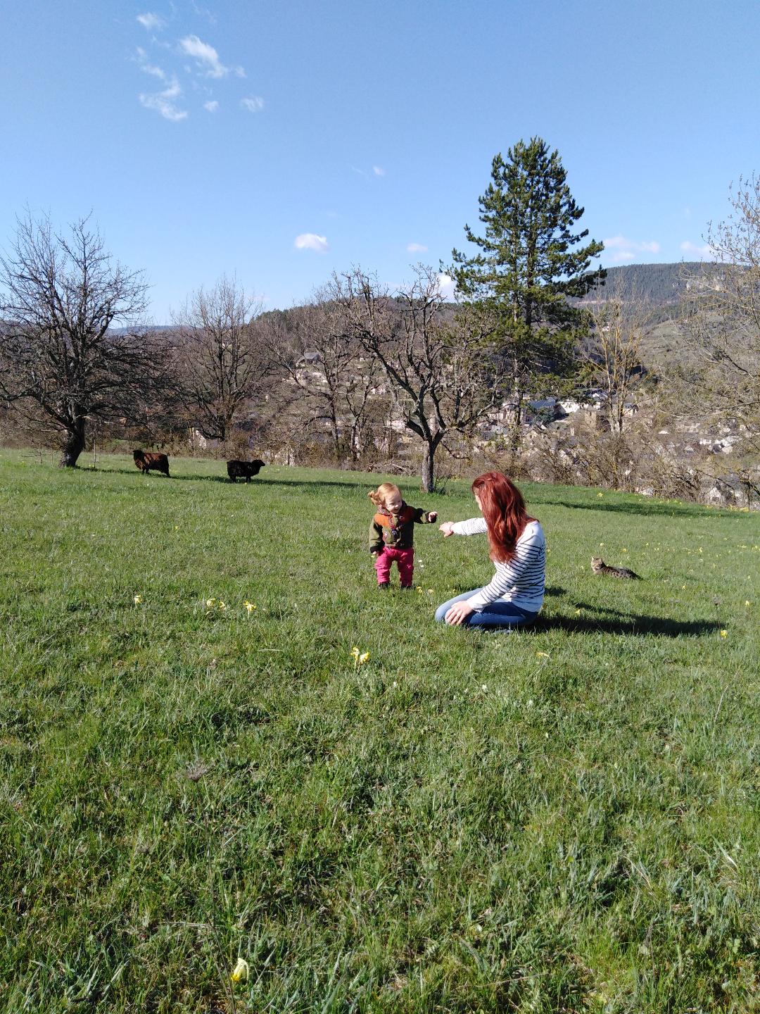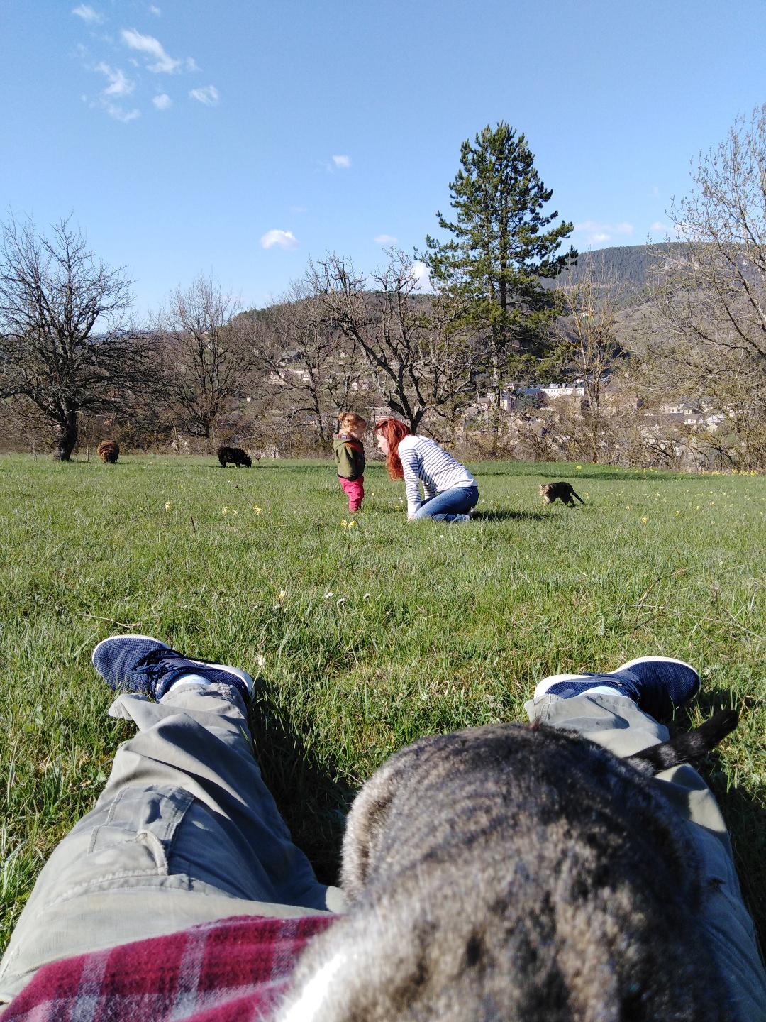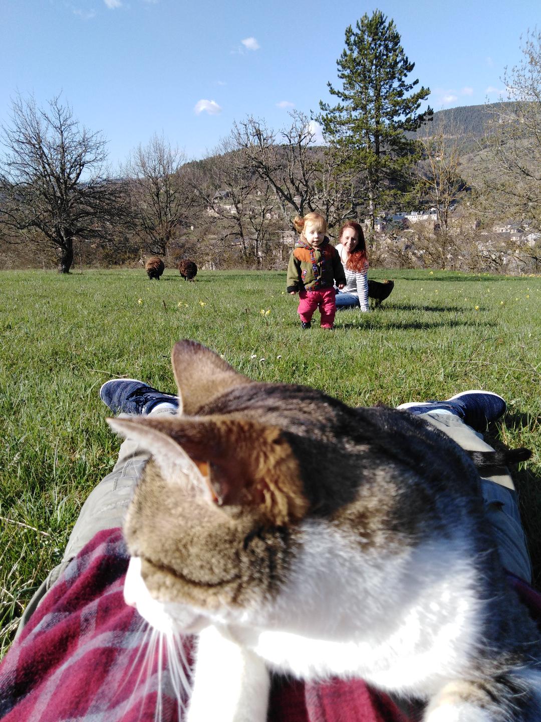 Heureusement on habite à la campagne, la dernière maison en bordure du village et pas dans un lotissement. Aujourd’hui on a pu rompre le confinement sans vraiment le rompre en allant promener dans le champ au dessus de notre maison. La vue est différente, déjà, et c’est plat (contrairement à notre jardin) donc Maxine peut courir partout. Comme en plus les chats ET les moutons nous ont suivi c’était trop classe. J’avais l’impression de partir à l’aventure.
