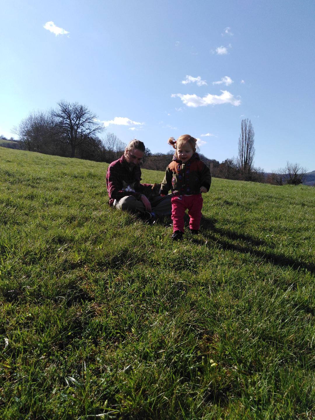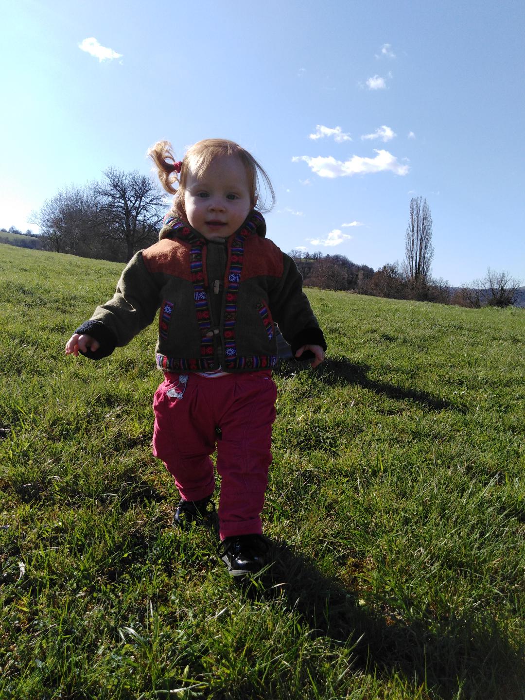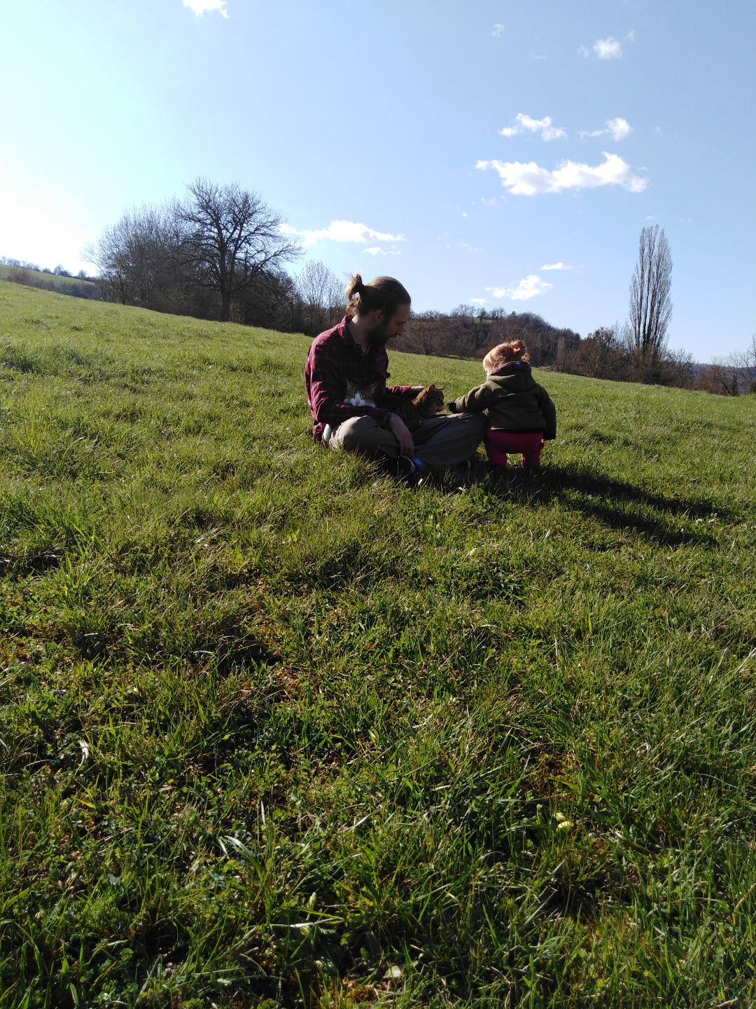 Heureusement on habite à la campagne, la dernière maison en bordure du village et pas dans un lotissement. Aujourd’hui on a pu rompre le confinement sans vraiment le rompre en allant promener dans le champ au dessus de notre maison. La vue est différente, déjà, et c’est plat (contrairement à notre jardin) donc Maxine peut courir partout. Comme en plus les chats ET les moutons nous ont suivi c’était trop classe. J’avais l’impression de partir à l’aventure.