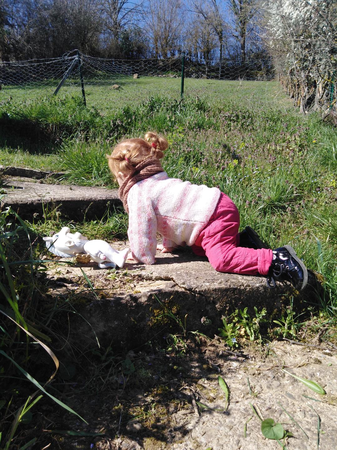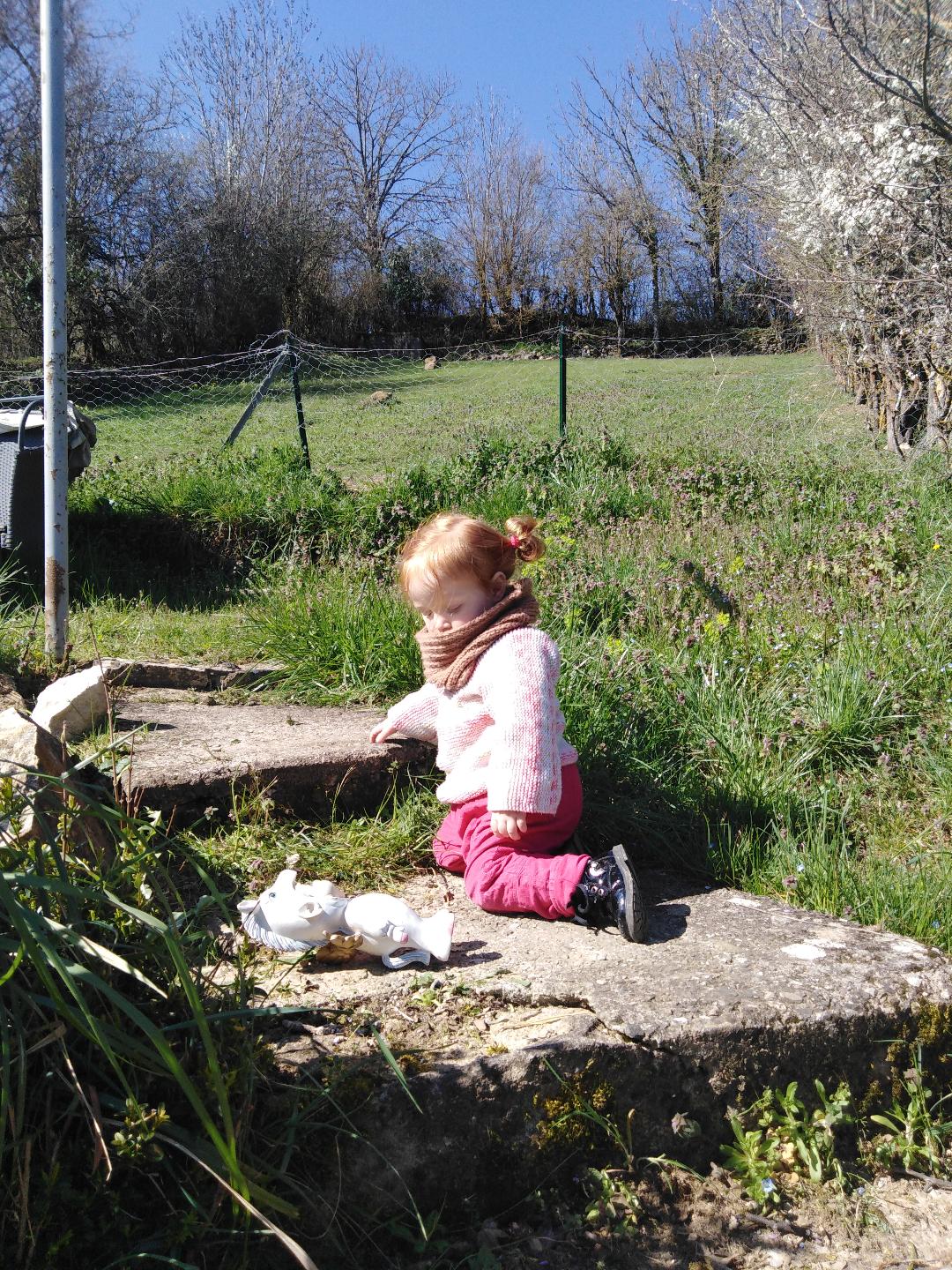 - Elle joue avec mon nain de jardin licorne comme si c’était une poupée alors qu’elle sait qu’elle a pas le droit. (Mais comme c’est toujours mieux que de jouer avec la bêche ou essayer de descendre les escaliers debout pendant que je jardine, je dis rien.)