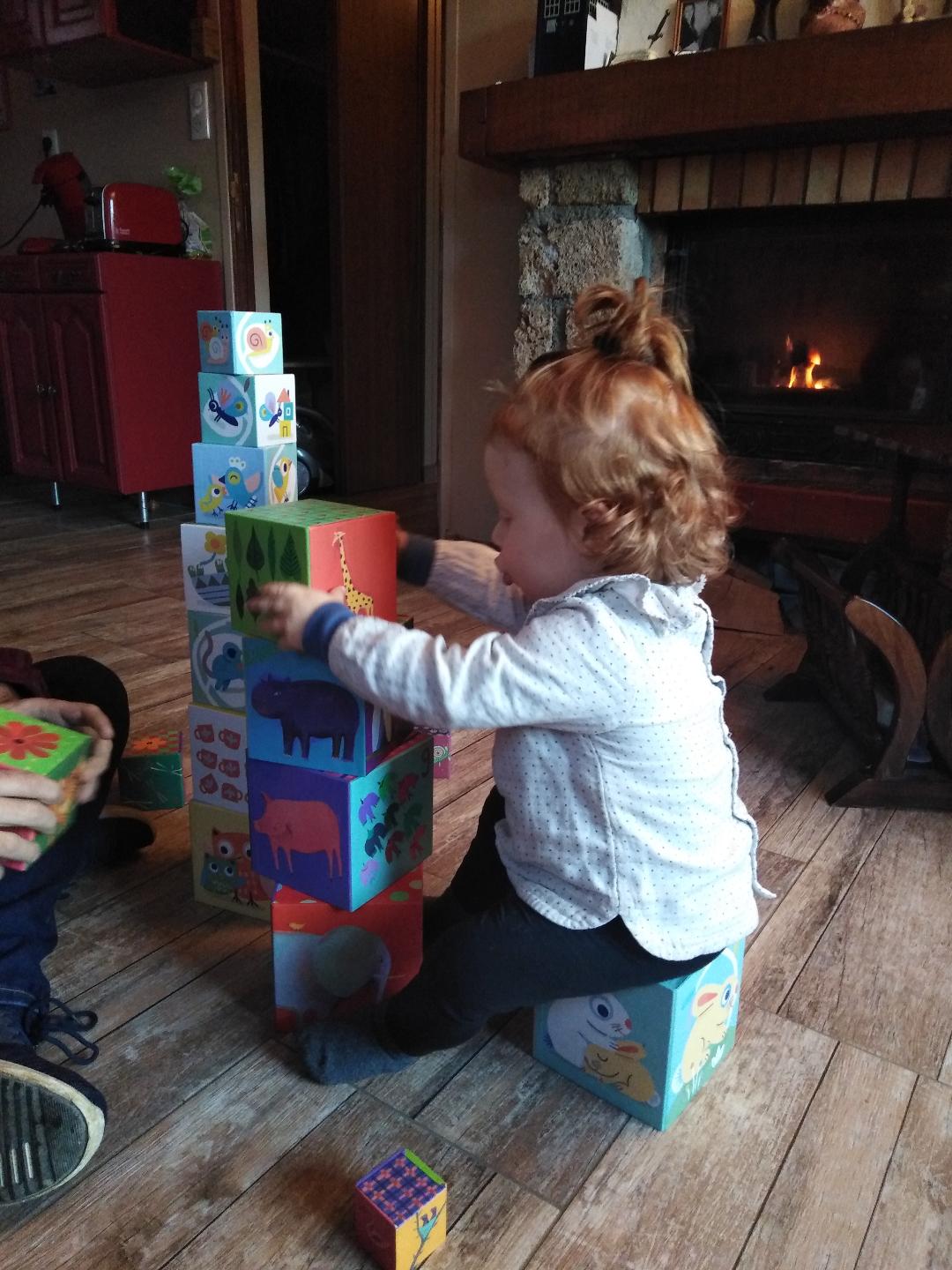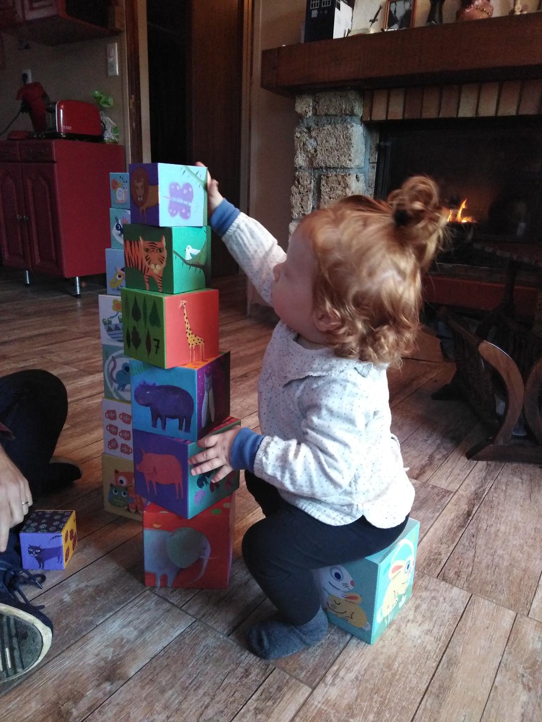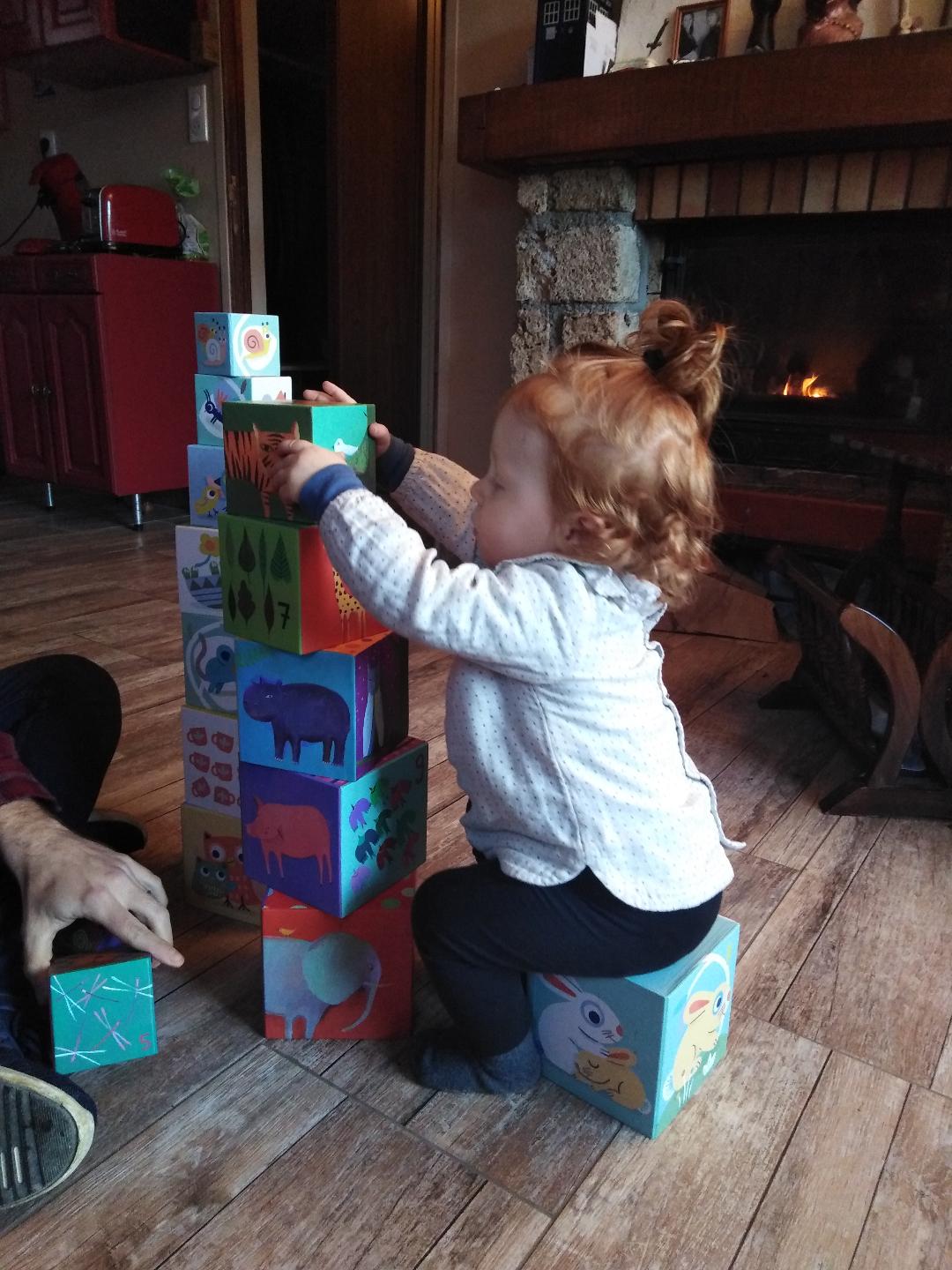 - Maxine a fait du yoga, joué avec ses cubes (merci Marie et Ophélie, elle les adore), tourmenté le chat, mangé un bonbon parce qu’on est samedi et nous a fait beaucoup de câlins parce qu’elle sort une dent et qu’elle est choinchoin.