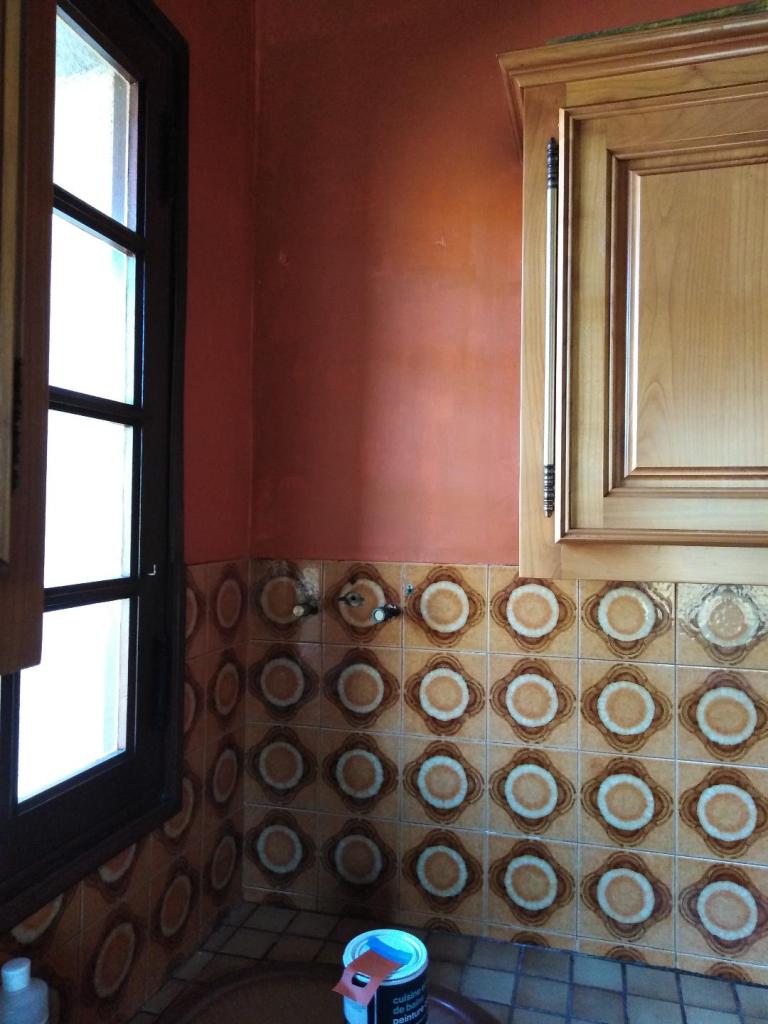 On a aussi repeint la salle de bain pour lui filer un coup de propre avant que notre plombier se dé-confine lui aussi et vienne la refaire. Parce qu’autant la cuisine on pouvait vivre avec autant la salle de bain ça va pas être possible. (Par contre on garde aussi la faïence verte et orange et les meubles en bois massif, je suis tellement contente!)
