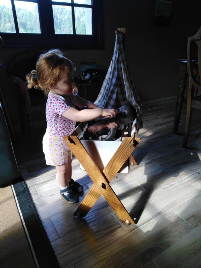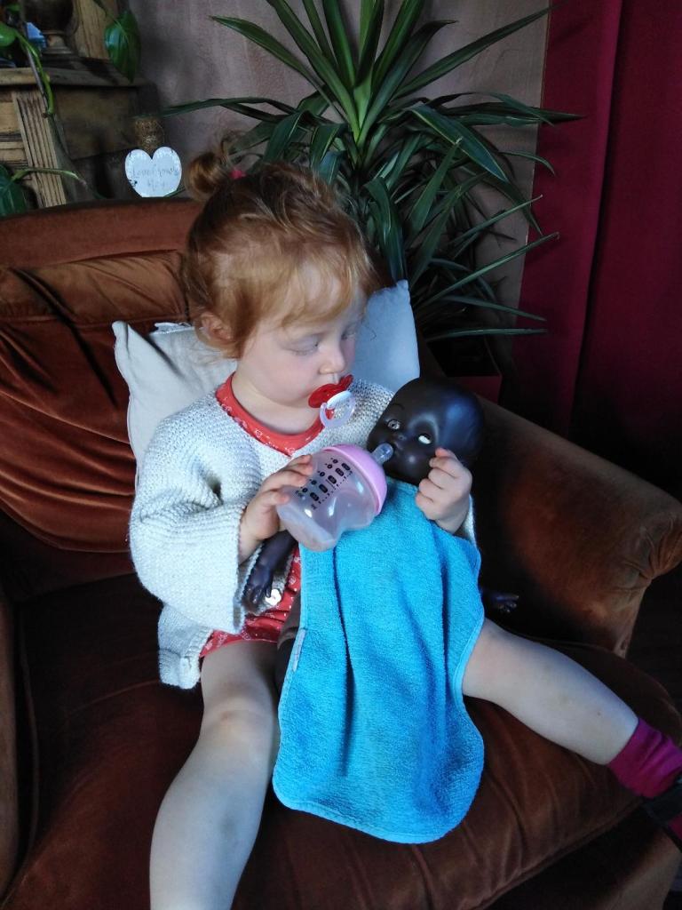 - Elle est à fond dans l’imitation, je pourrais la regarder faire pendant des heures, surtout depuis qu’on a reçu le landau et le lit pour son poupon. (Landau et lit commandés sur Vinted, poupon qui était à moi quand j’étais petite. On peut faire des enfants et les rendre heureux sans massacrer la planète à coup d’hyper consommation. Je me répète mais c’est important).