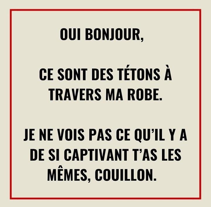 - Mesdames, si deviner mes tétons à travers mon tee-shirt vous fait penser que je suis une salope ou vous donne envie d’attacher votre homme au cas où, encore une fois, c’est votre problème pas le mien. Si vous jugez les femmes à leur tenue vous ne valez pas mieux que tous les connards qui voudraient nous enfermer à la cuisine. Et si vous pensez vraiment que votre homme va partir pour si peu, posez vous les bonnes questions. Avez vous choisi de partager votre vie avec un gros queutard? Encore une fois, ce n’est pas mon problème.