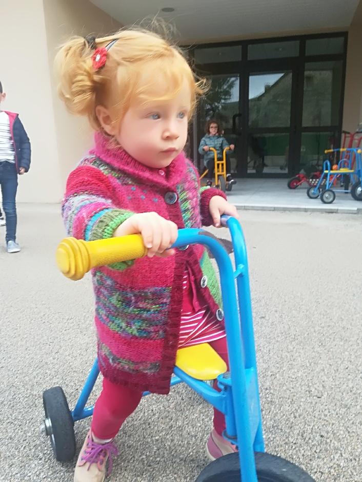 Vers 11h nous avons reçu un texto de la maîtresse pour nous dire qu’après deux petits coups de blues de deux minutes chacun Maxine allait très bien, qu’elle avait fait de la peinture, de la pâte à modeler, de la motricité et que là tout de suite, c’était la récré et qu’elle était sur un vélo. Photos à l’appui.