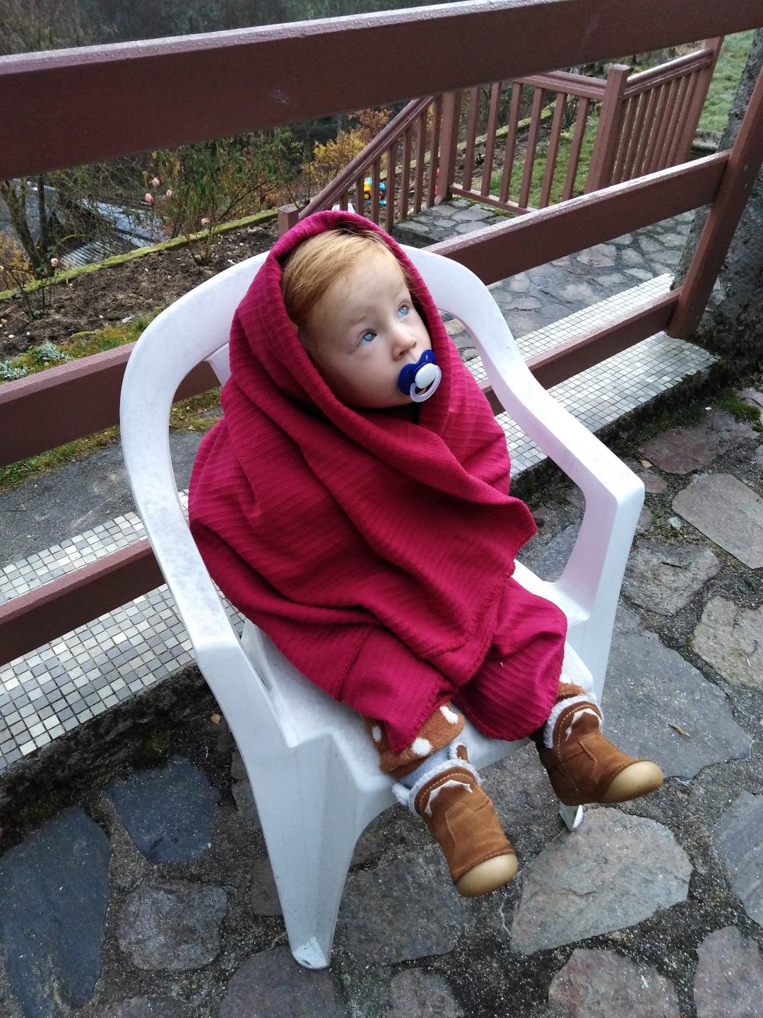 - Un matin bien brumeux et bien, BIEN, froid Maxine a voulu sortir pour regarder la lune. A 7H30. Du coup on s’est emballées dans des plaids et on est allé sur la terrasse. Je lui ai dit qu’elle ressemblait à E.T dans son plaid rouge. Elle a pas compris. Du coup je lui ai expliqué et je lui ai montré la bande annonce. Depuis elle dit « Maxine attend E.T, il va revenir de sa planète pour faire briller ton doigt. E.T téléphone maison. E.T il est dans ta tête, Maxine elle veut un doigt qui brille ».