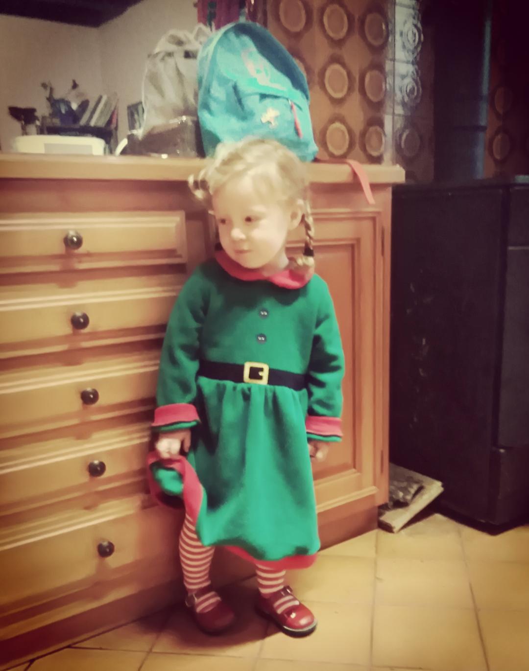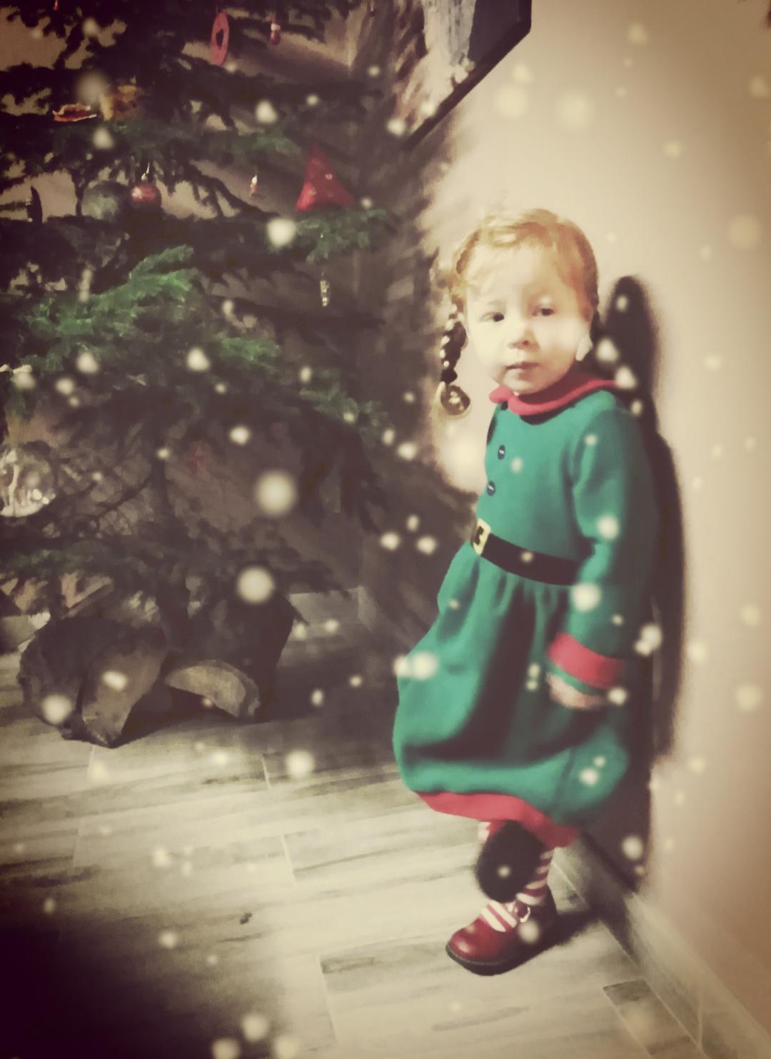 Ce matin Maxine a mis sa robe de lutin, ses collants à rayures et ses chaussures rouges « qui font clac clac ». Elle m’a même laissé lui faire des tresses. Elle m’a même laissé la prendre en photo! Sans courir partout. MIRACLE DE NOEL!