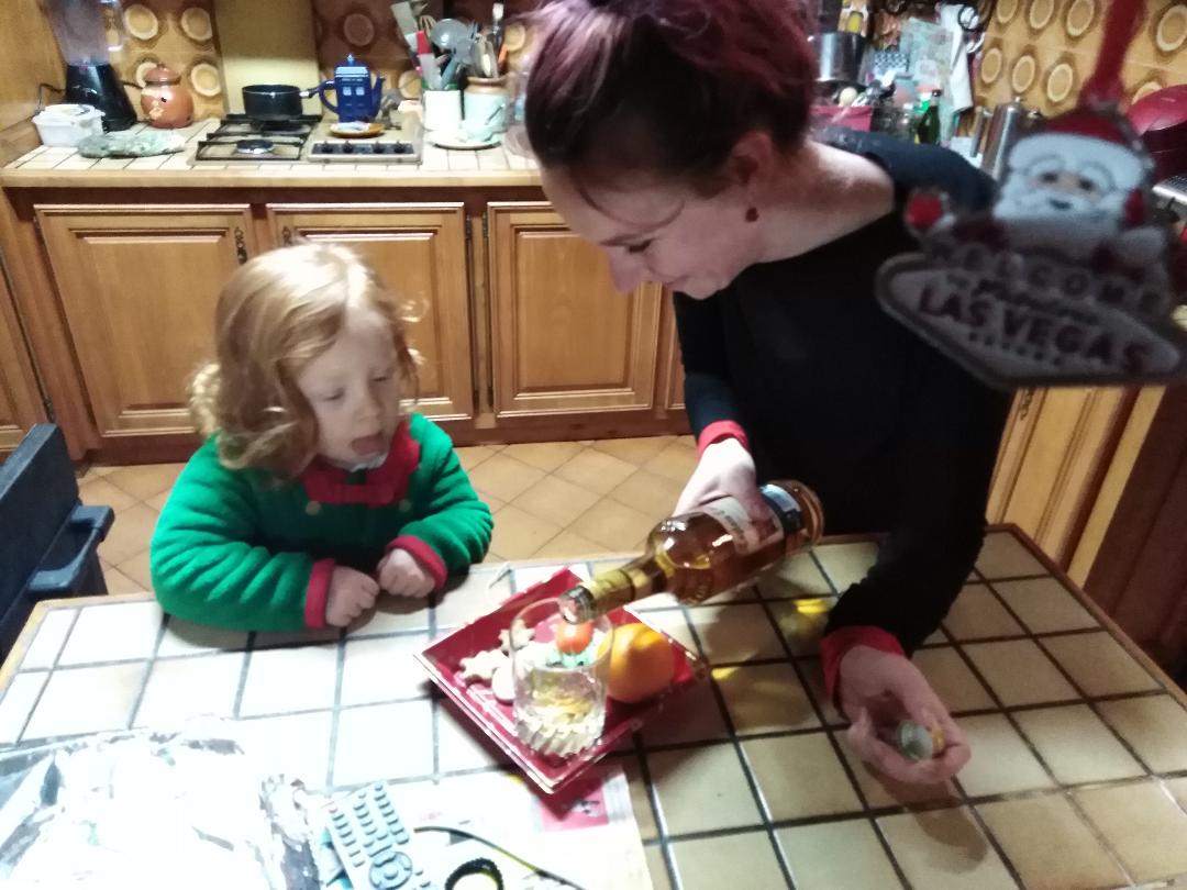 On a préparé l’assiette du Père Noël. On avait oublié d’acheter des carottes pour Tornade, Danseur, Furie, Fringant, Comète, Cupidon, Tonnerre, Éclair et Rudolph (oui, je connais les prénoms des rennes du Père Noël), Maxine a mis celle en bois de sa dinette, on a rajouté des cookies et une mandarine pour le Père Noël et quand je lui ai demandé ce qu’elle voulait lui mettre à boire elle a dit « du rhum », je voulais pas la froisser et je savais qu’Arnaud finirait plus facilement le verre si c’était du Captain Morgan à la place du lait, je me suis donc exécutée. Après on l’a posé sur le rebord de la fausse cheminée et je me suis re félicité de cet achat parce que c’était vraiment trop joli .