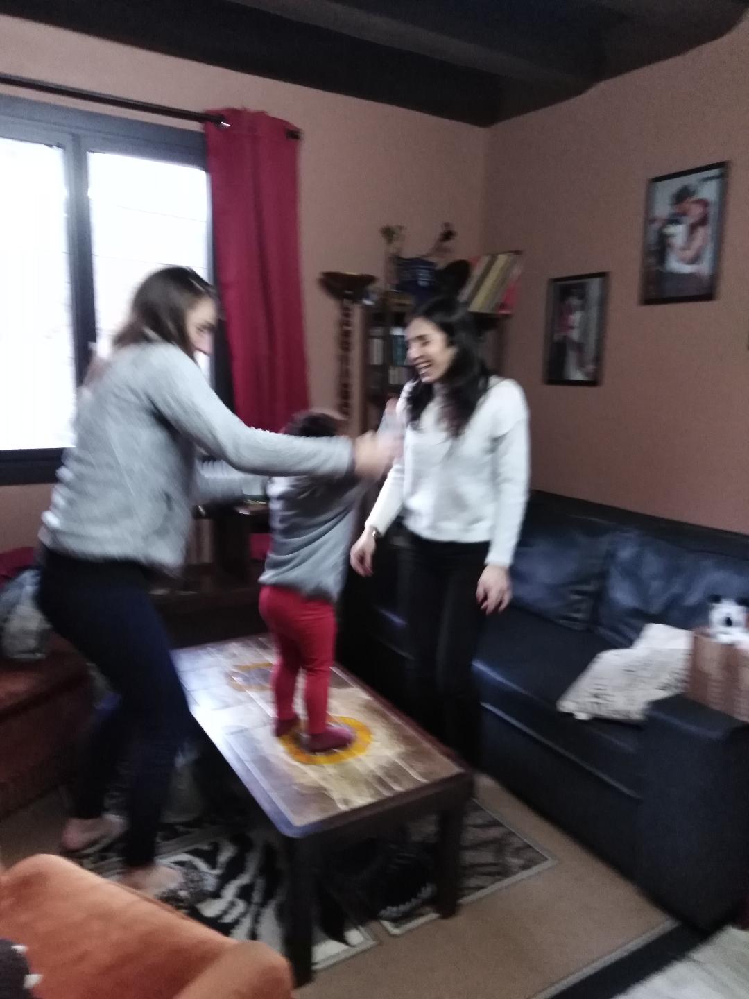 - La mini boum improvisée dans le salon avec Maxine trop contente de danser sur la table avec ses taties. (Maxine était sur la table, pour une fois ses taties sont restées par terre, question d’exemple).