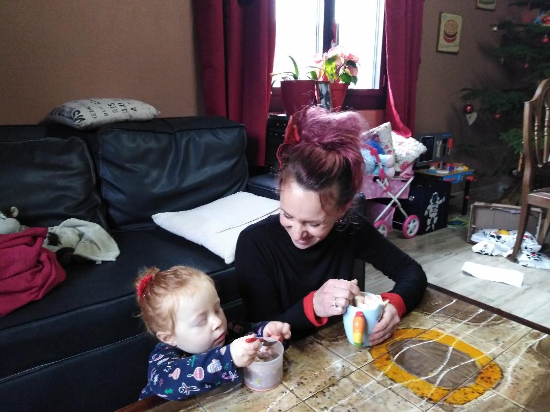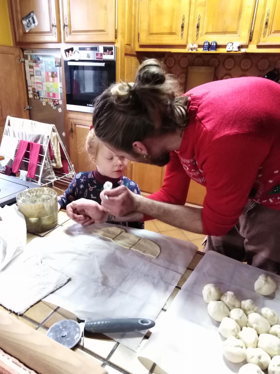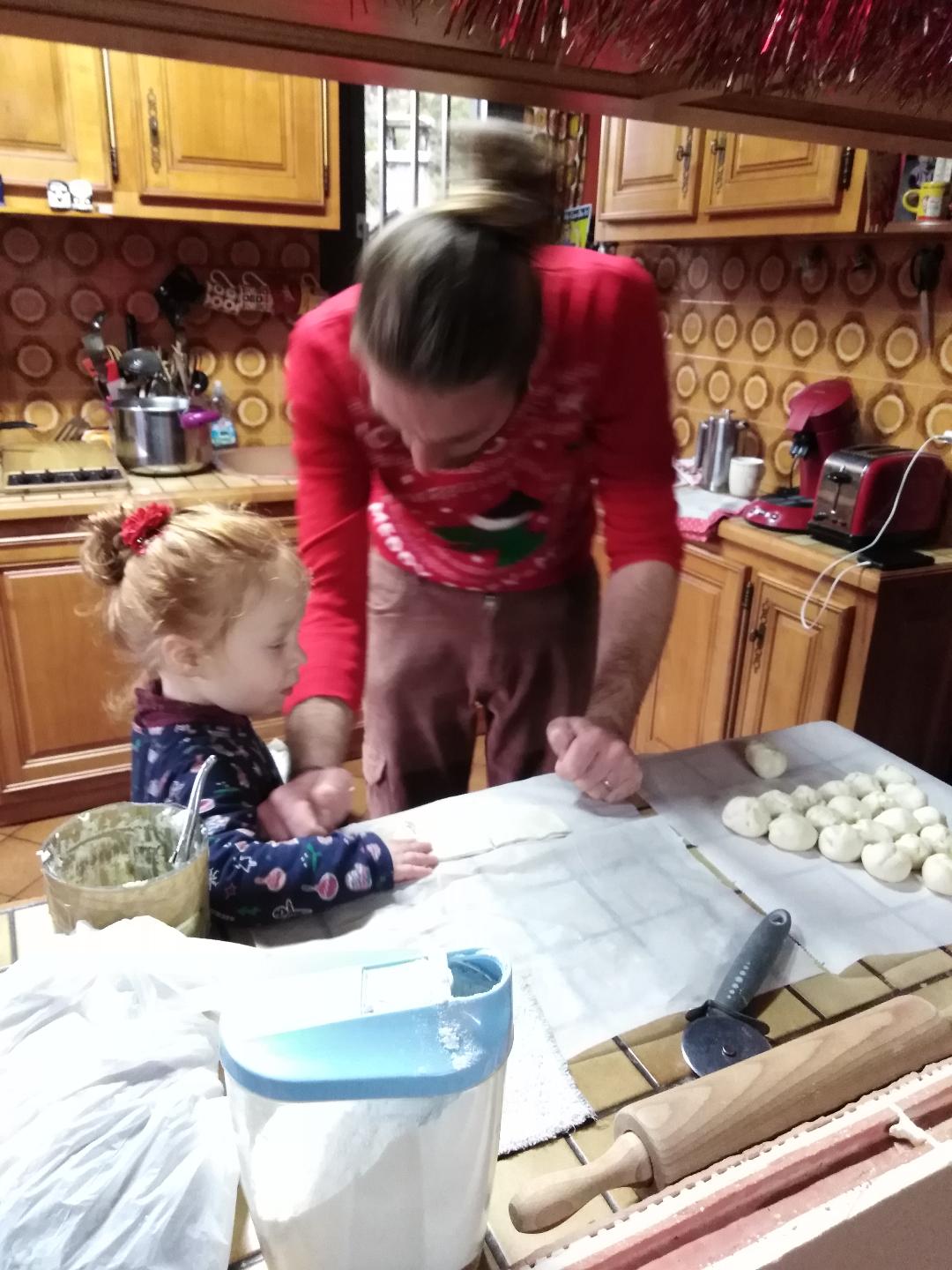 Le matin on a fait de la cuisine pour le soir et le lendemain midi. Maxine a aidé son papa à réaliser son fameux « sapin aux boules de fromage ». Et elle a réussi à rester calme et à ne rien voler sur mon plan de travail le temps que je prépare mon fameux « roulé au saumon » (même si, juste quand je venais de finir, elle a essayé de tout jeter par terre AVANT que je ne l’ai emballé. Je l’ai rattrapé in extremis, je considère la matinée cuisine comme un succès).