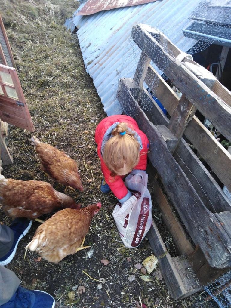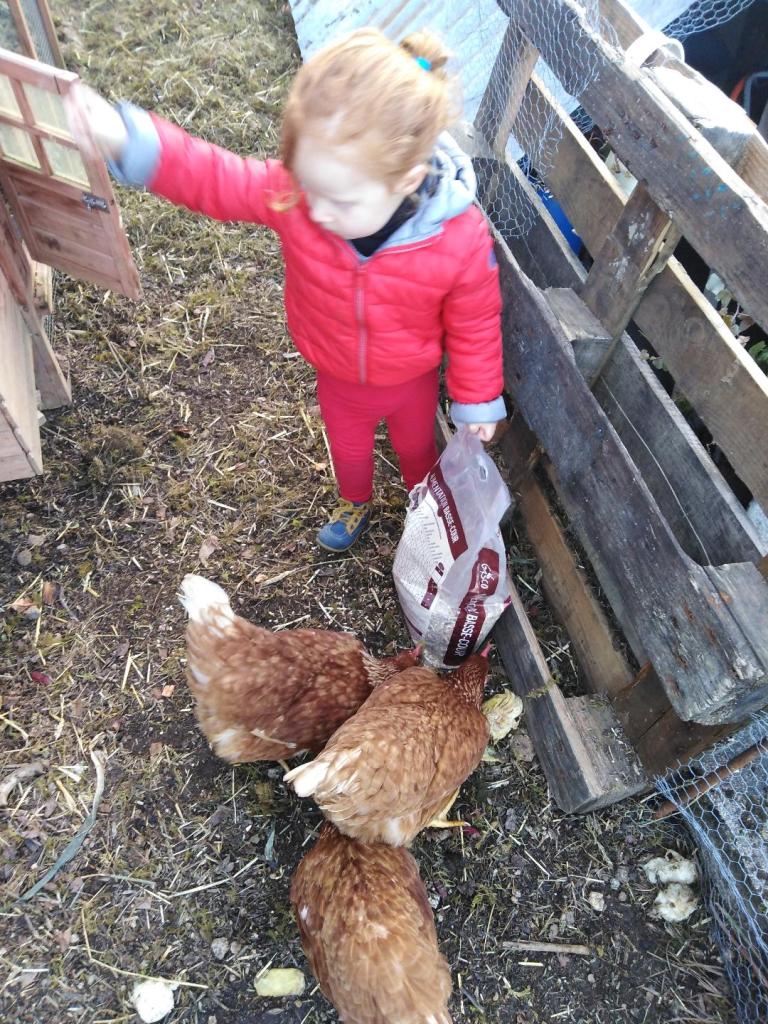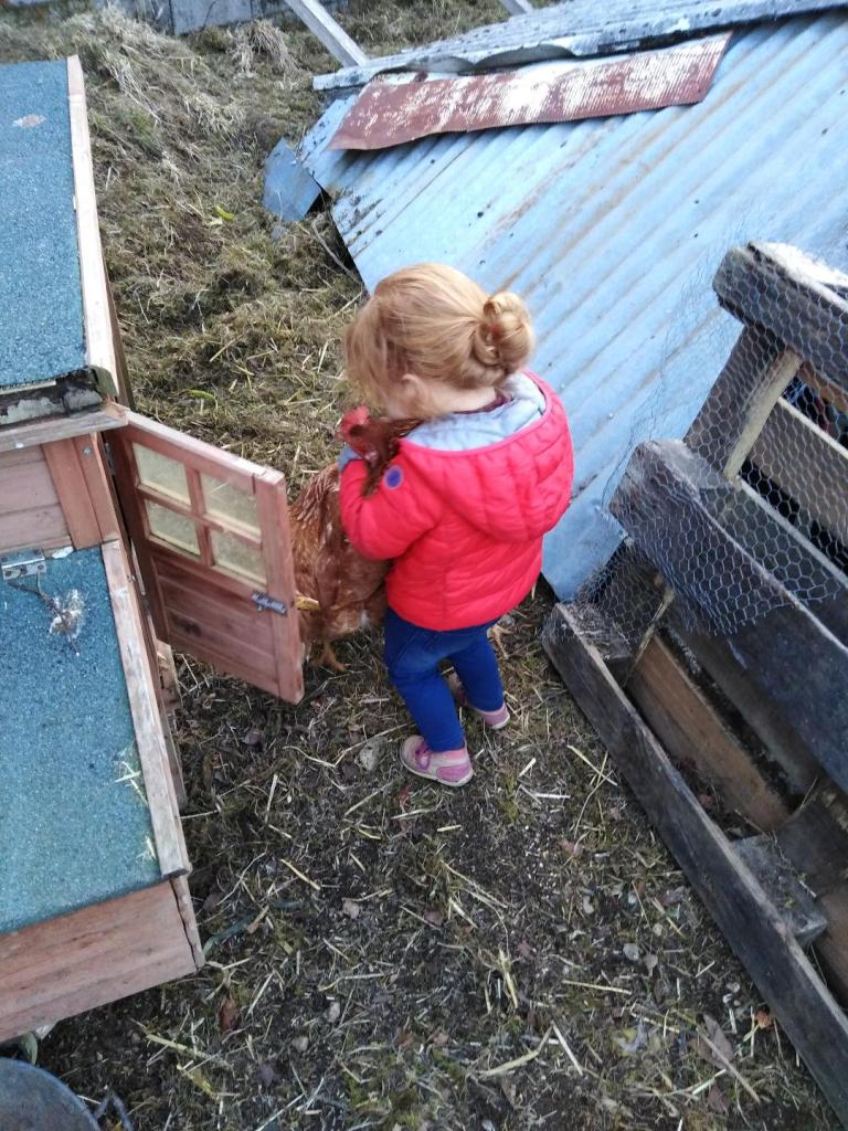 Double effet positif, contrairement à ses parents qui ont attendu d’avoir largement plus de 30 ans pour arrêter d’avoir peur que les poules fassent, je cite, « flapflap », quand il faut les porter (ce qui est tout à fait entendable pour Arnaud qui a grandi à Marseille mais hyper honteux pour moi) Maxine n’a pas peur. Elle leur fait des caresses, des câlins, elle les prend dans ses bras pour les rentrer dans leur cabane et, des fois, elle leur met un petit coup de pied quand elles veulent manger le grain trop vite et qu’elle a pas fini de compter les 8 poignées qu’elle doit leur donner de chaque sac.