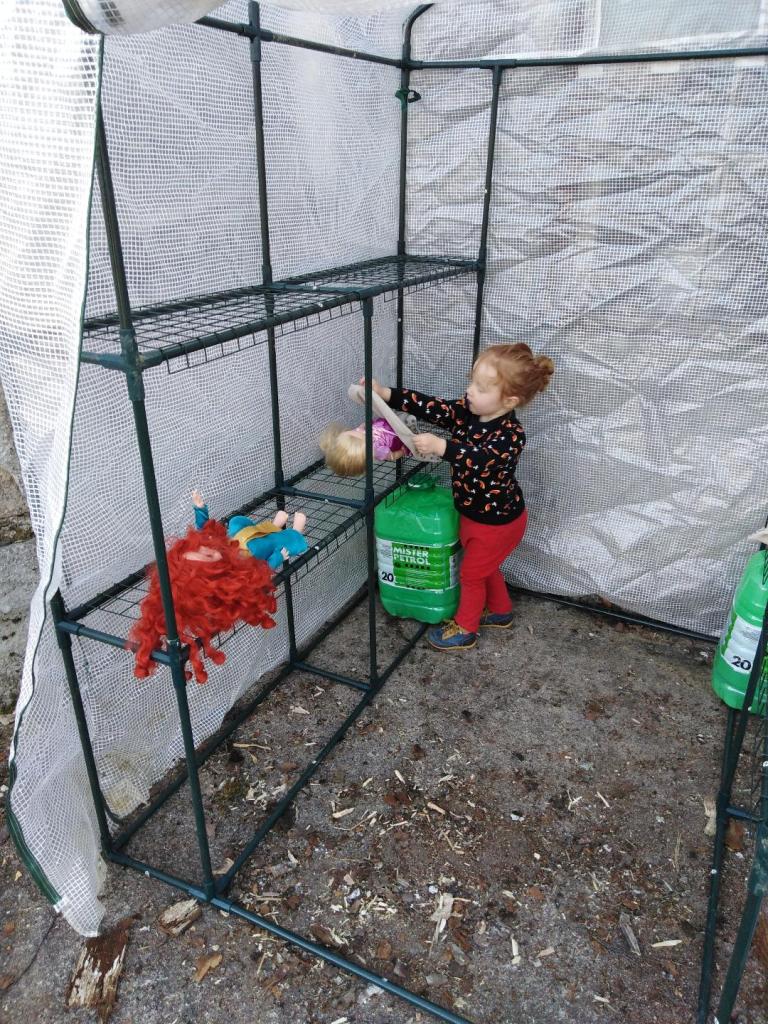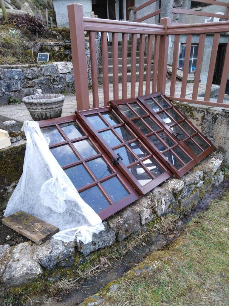 On a retourné les plates bandes (technique des « faux semis » dégottée dans Rustica), planté des tulipes, déplacé des jonquilles et des rosiers, enrichi les nouvelles plates bandes, étalé du compost, planté un poirier et un prunier, de la menthe et du romarin, déplacé des framboisiers, semé du gazon aux deux anciens poulaillers, monté la serre (Maxine a décidé que c’était l’hôtel de ses poupées, pour l’instant j’ai le droit d’utiliser que les étagères du haut), préparé des semis à mettre dedans et planté des trucs sous des abris qu’on a fabriqué avec nos vieilles fenêtres.