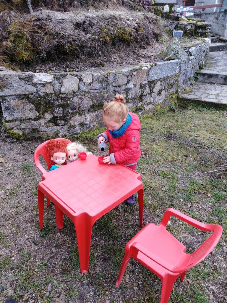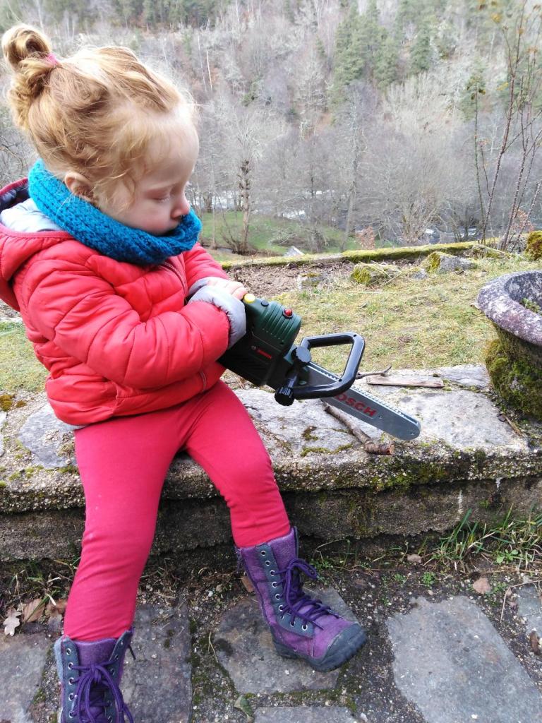 Du coup on a fait des balades en forêt pour ramasser du bois mort et repérer les arbres déjà tombés à débiter dans un futur proche. On a éclairci des bosquets de bouleaux autour de la maison. Arnaud a scié des troncs. Moi j’ai débité des petites branchouilles au sécateur pour faire du bois d’allumage (rien ne se perd). Maxine a pris sa tronçonneuse pour nous aider. Quand elle en avait marre elle faisait une pause avec ses princesses sur son salon de jardin pour boire le thé.
