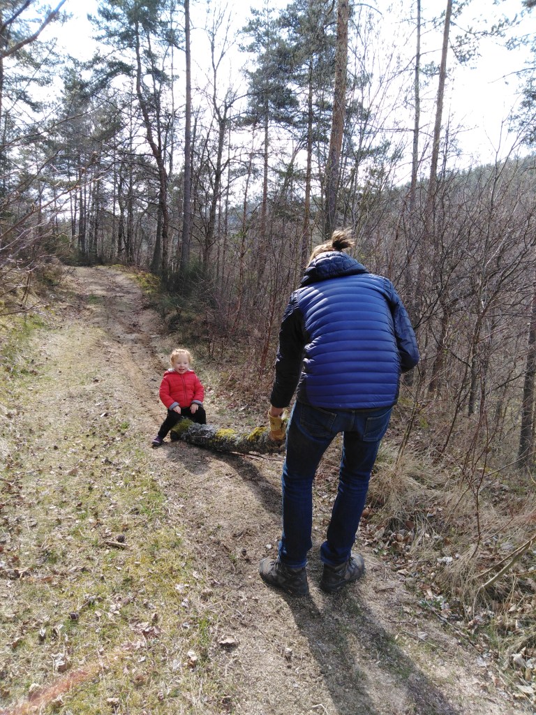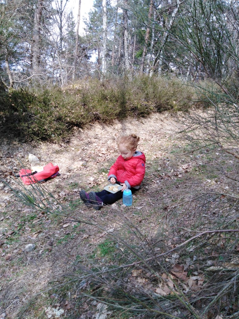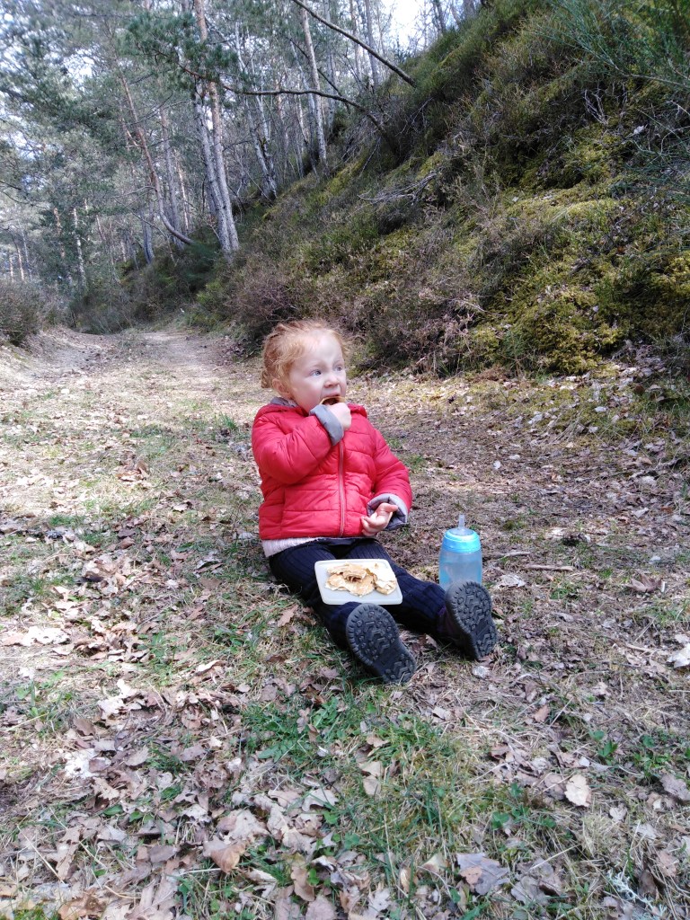 Après la sieste pour motiver Maxine on a pris son sac petit ours brun et on a mis des crêpes dedans (et des quartiers de pomme pour l’équilibre, mais c’est pas ça qui l’a motivé) et on lui a dit qu’on partait regarder et encourager papa qui allait couper des arbres.