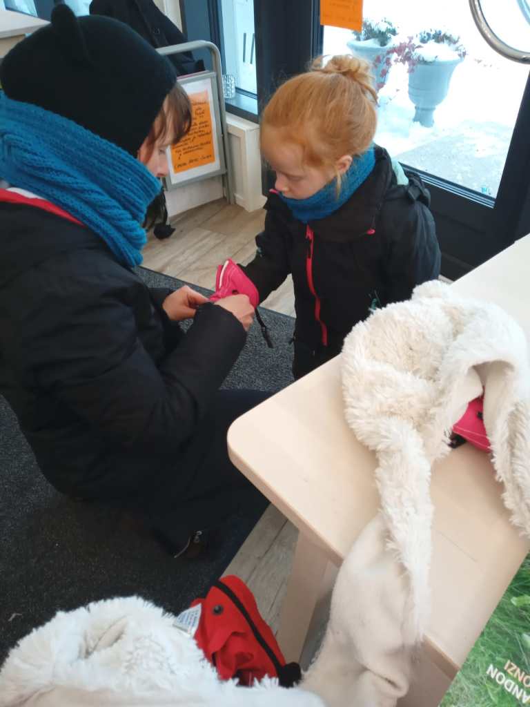 On est allé au buffet de la gare prendre un petit déjeuner. J’ai juste eu le temps de m’émerveiller une minute trente sur les roulés à la cannelle puis Maxine a commencé une longue série de caprices. Elle avait chaud. Elle voulait aller dehors. Mais pas remettre sa tenue de neige. Son cacao était trop chaud. Puis trop froid. Puis pas bon. Puis elle grimpait debout sur les banquettes et refusait de descendre. Et encore 50 autres trucs qui m’ont fait dégoupiller bien trop de fois pour un premier jour de vacances à l’étranger et avant 8h du matin.