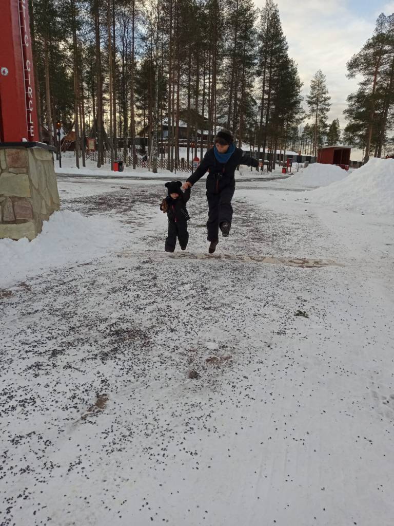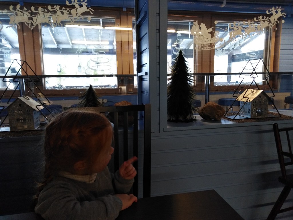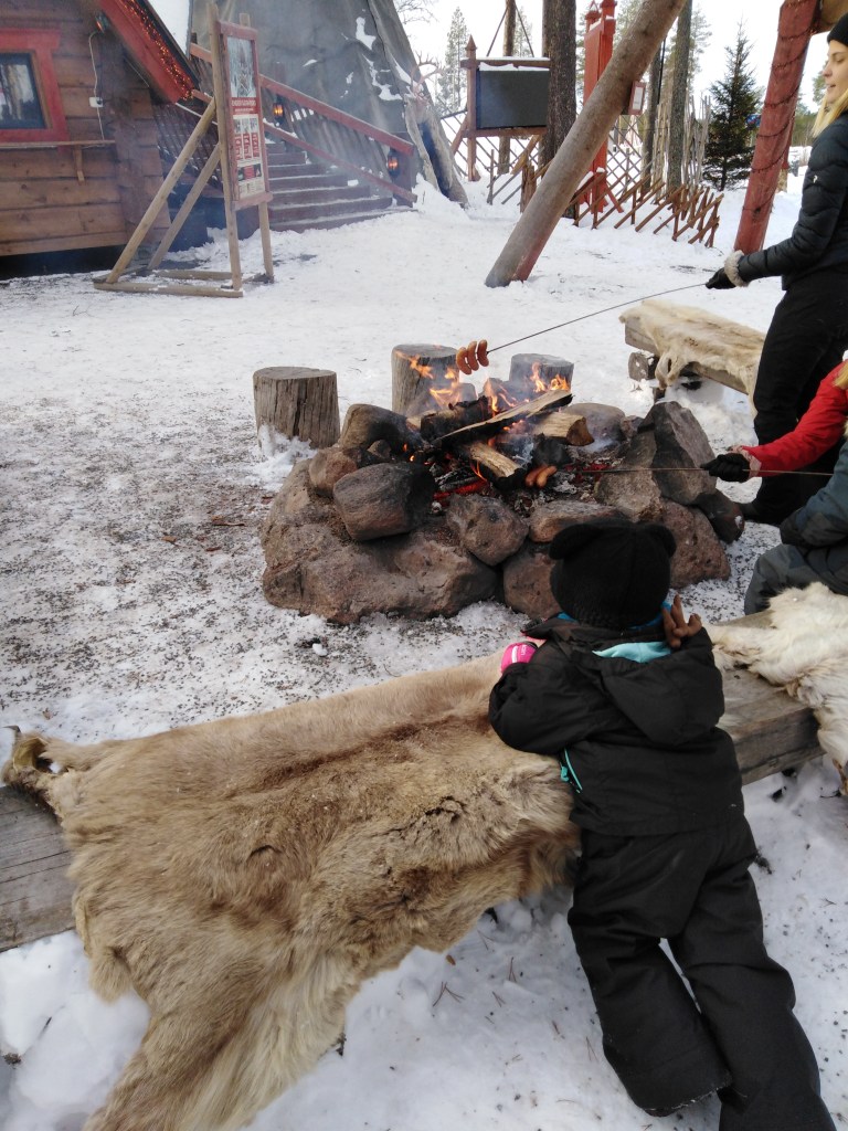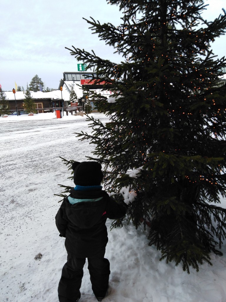 Donc tout est très beau mais tout est très cher. Par exemple la balade en traîneau c’est 70 balles les 3 kilomètres. Par personne. La saucisse à griller coûte le prix d’un demi porc et ainsi de suite. Du coup on a juste fait le tour à pieds. Maxine a adoré regarder le feu et monter et descendre les escaliers qui mènent à la maison de la mère Noël au fond de la forêt. Avec ma mère on a adoré le silence et la lumière très particulière qui ne rend absolument pas sur les photos.