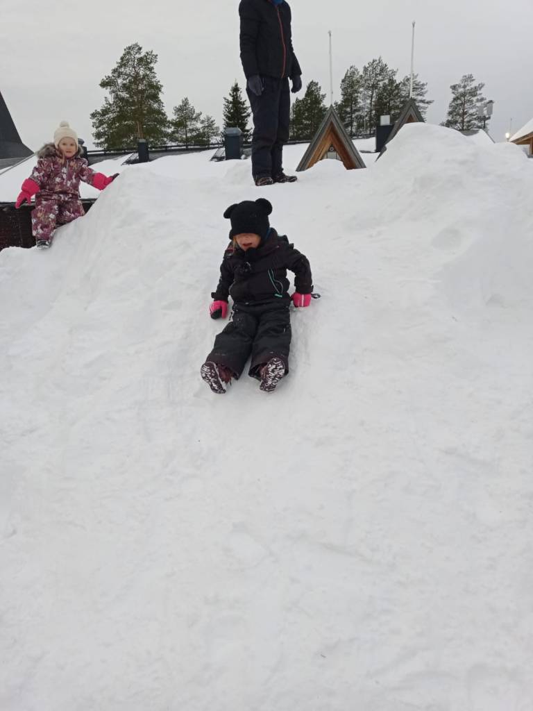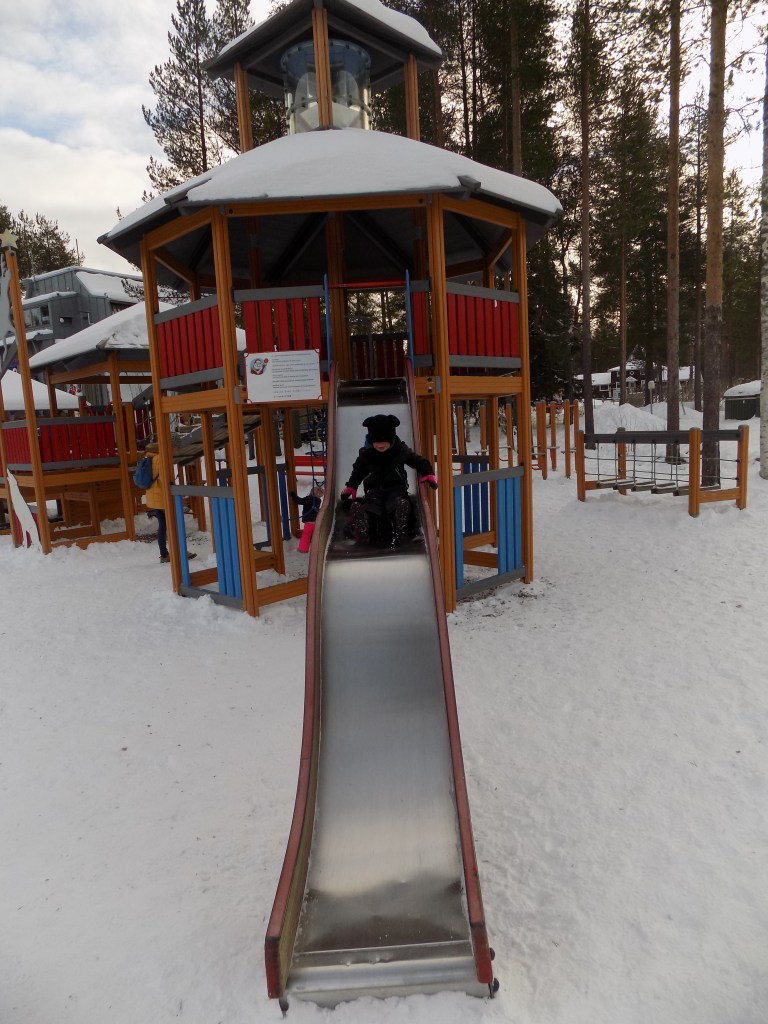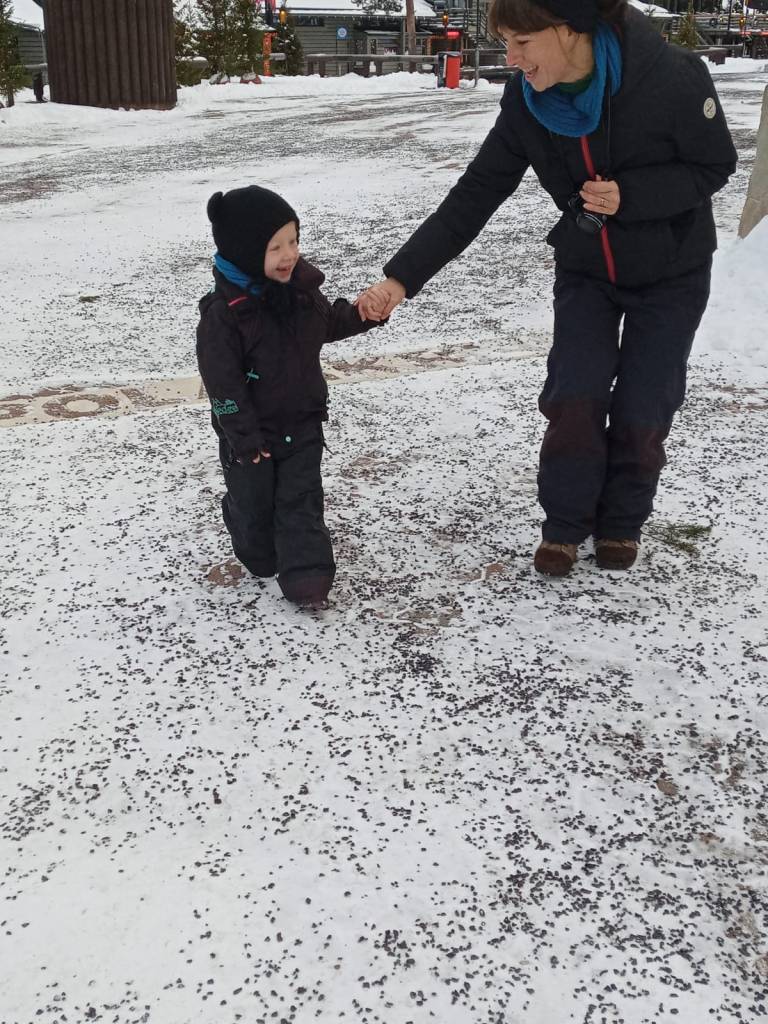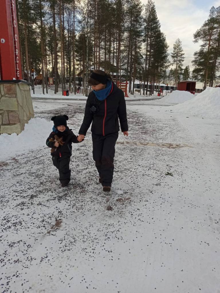 Donc tout est très beau mais tout est très cher. Par exemple la balade en traîneau c’est 70 balles les 3 kilomètres. Par personne. La saucisse à griller coûte le prix d’un demi porc et ainsi de suite. Du coup on a juste fait le tour à pieds. Maxine a adoré regarder le feu et monter et descendre les escaliers qui mènent à la maison de la mère Noël au fond de la forêt. Avec ma mère on a adoré le silence et la lumière très particulière qui ne rend absolument pas sur les photos.