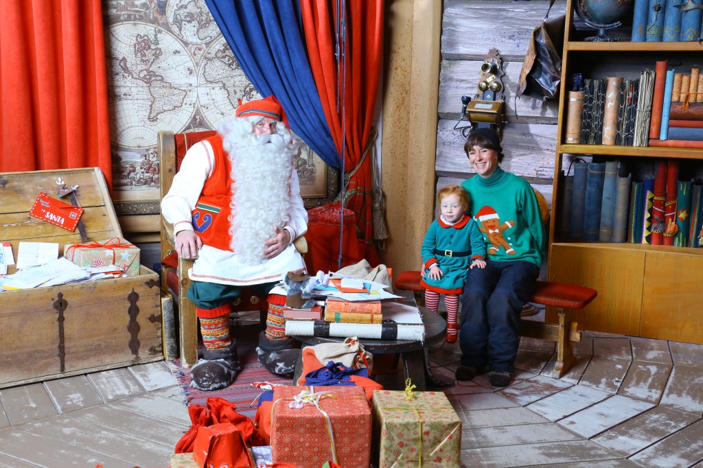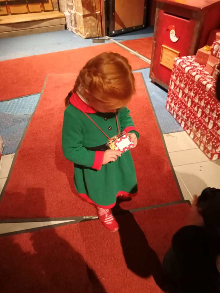 On a discuté 2 minutes puis le lutin nous a fait signe pour qu’on prenne une photo. Le père Noël a donné son cadeau à Maxine. Il lui a dit de lui écrire une longue liste. Je lui ai dit de se calmer. Et après lui avoir envoyé plein de bisous un lutin nous a escorté jusqu’à la sortie.