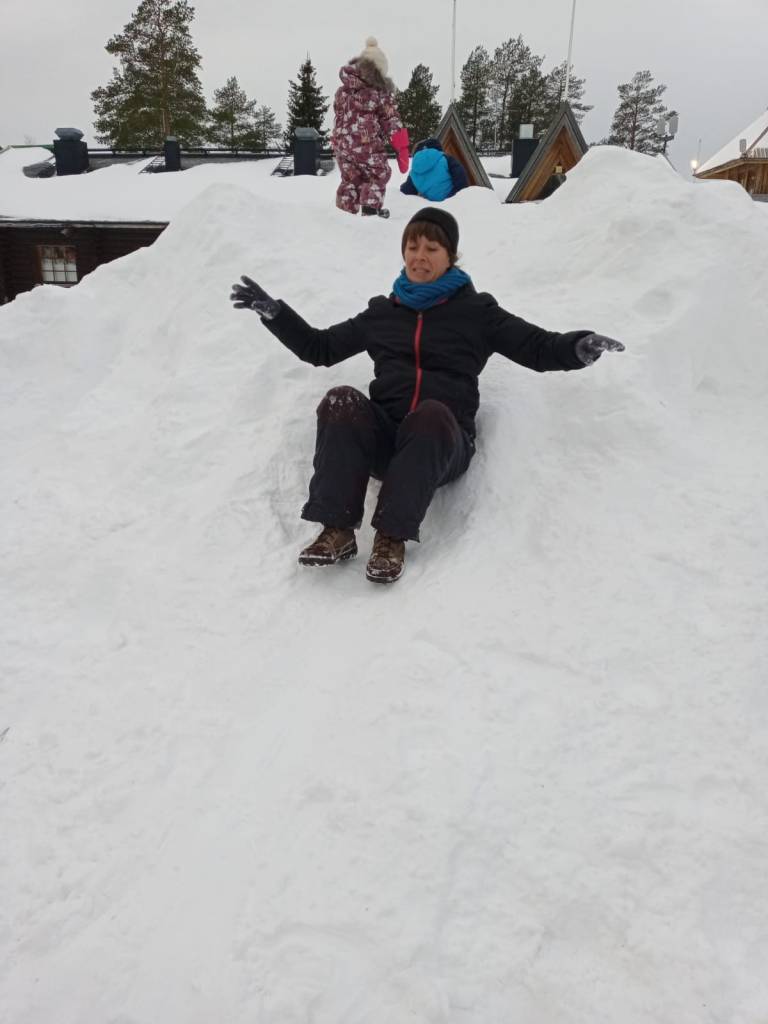 Un peu de luge sur les fesses pour la digestion et parce qu’ils avaient fait un grand tas de neige au milieu du village, un dernier tour dans les boutiques de souvenirs où on a été plus que raisonnables (pour la simple et bonne raison qu’on avait qu’un sac à dos chacune, avec une valise j’aurais tout ramené) et on a pris le bus pour rentrer en ville. Oui parce que dans ce sens là il y avait un bus! Maxine était fatiguée, elle s’endormait dans le porte bébé. Moi j’étais crevée, moitié d’avoir gueulé non stop depuis deux jours moitié d’avoir rencontré le Père Noël. La traversée de la forêt en bus était magique, il y avait encore plus de chalets que sur la route du matin. La conduite en revanche était encore plus flippante en bus, on sentait bien les glissades.